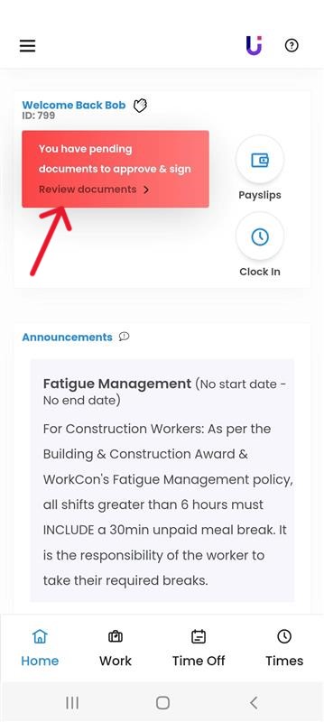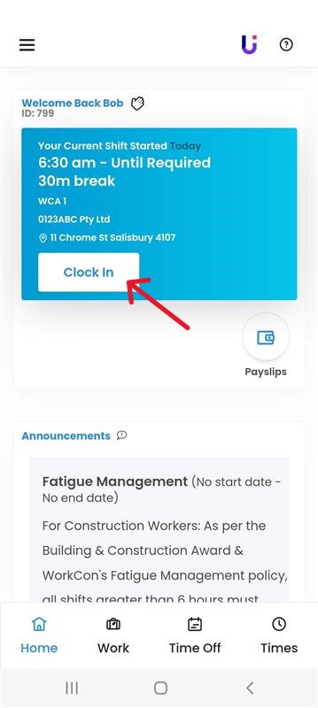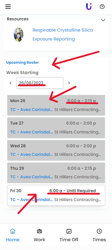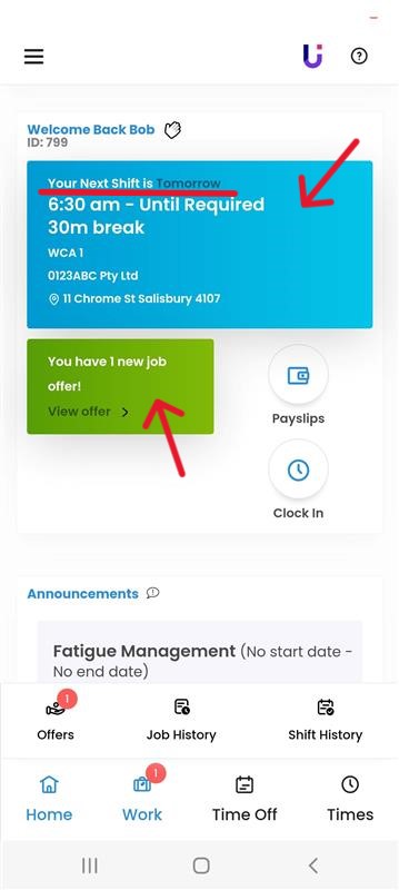 Tomorrow’s shift will be displayed on the screen. Any un-actioned shift offers, will also be displayed in this area.