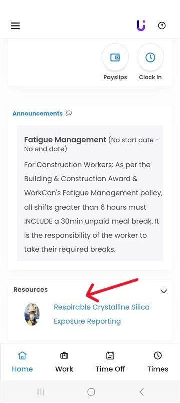 1. Click the “Respirable Crystalline Silica Exposure Reporting” link in the Resources section on the home screen of the foundU app.